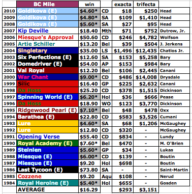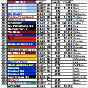 These charts for the original Breeders’ Cup races include information about the past winners: win payout, track, exacta and trifecta prices, and trainer. Averages are calculated for all of the payouts and European grass winners are marked.