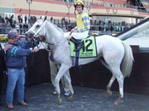 Post race festivities centered on the namesake owner Dr. Kendall Hansen. Dr. Hansen was dressed in a royal blue tee shirt with the words “The Great White Hope 05.05.12”. The letter o was replaced with a red rose. The rose and the date, of course refer to the goal of the Kentucky Derby on the first Saturday in May. He has been in the spotlight recently when his request to dye the mane and tail of the near white horse, was denied by the NYRA stewards. Dr. Hansen said, “I considered outfitting the horse with a blue tail extension.”